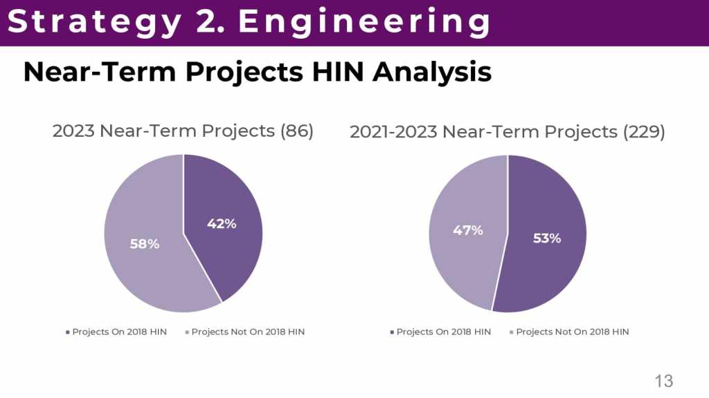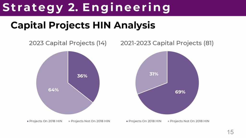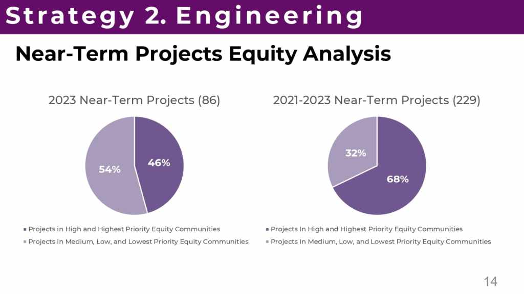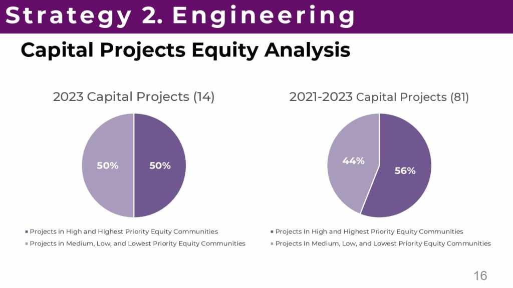 - 95% of high-injury streets is in Medium to High Priority Equity Neighborhoods.