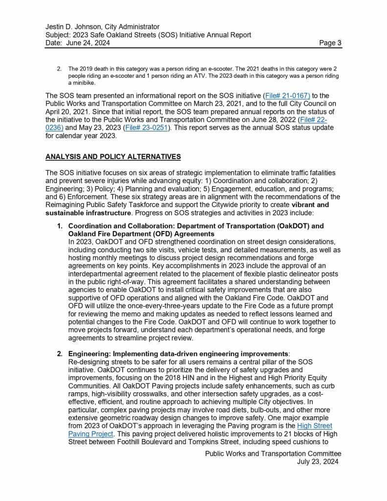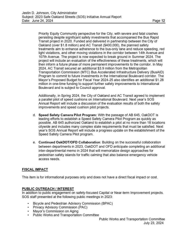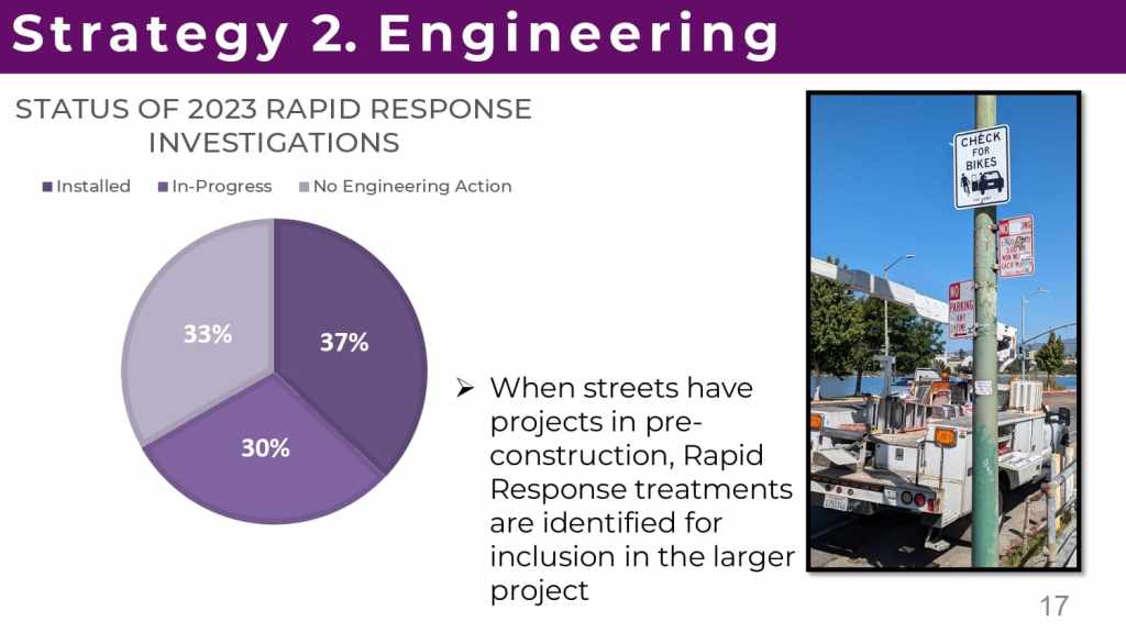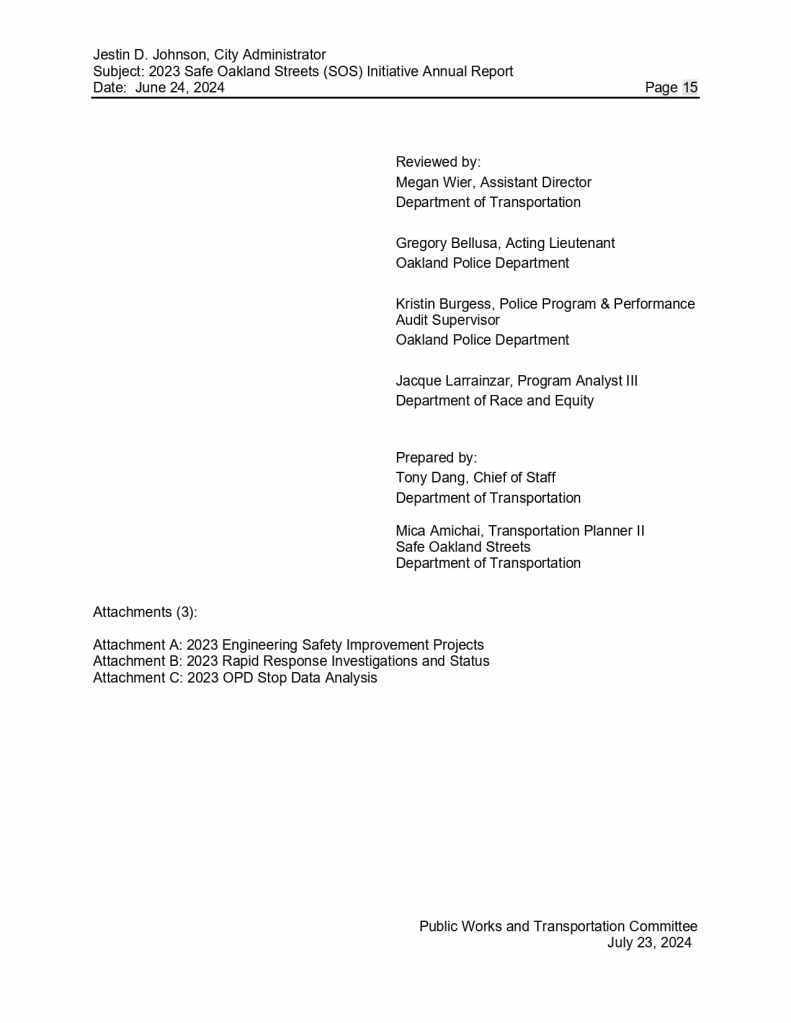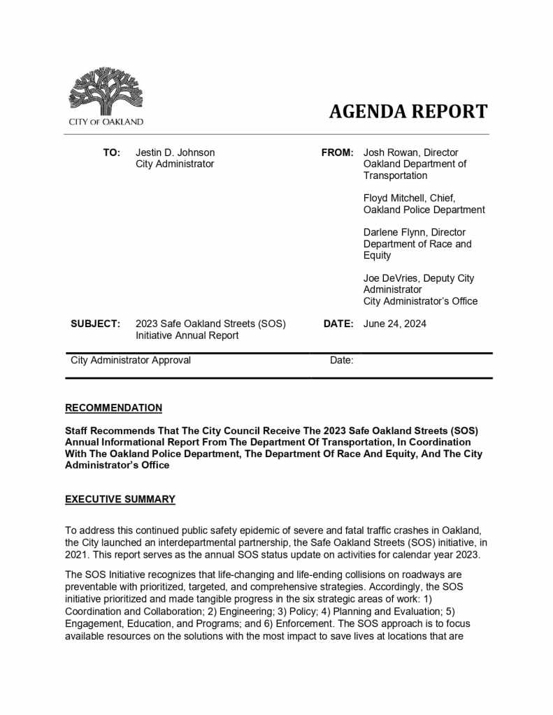 At the September 19, 2024 BPAC meeting, OakDOT Safe Oakland Streets Coordinator (SOS) Mica Amichai will present information from the 2023 annual Safe Oakland Streets update.