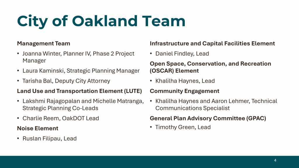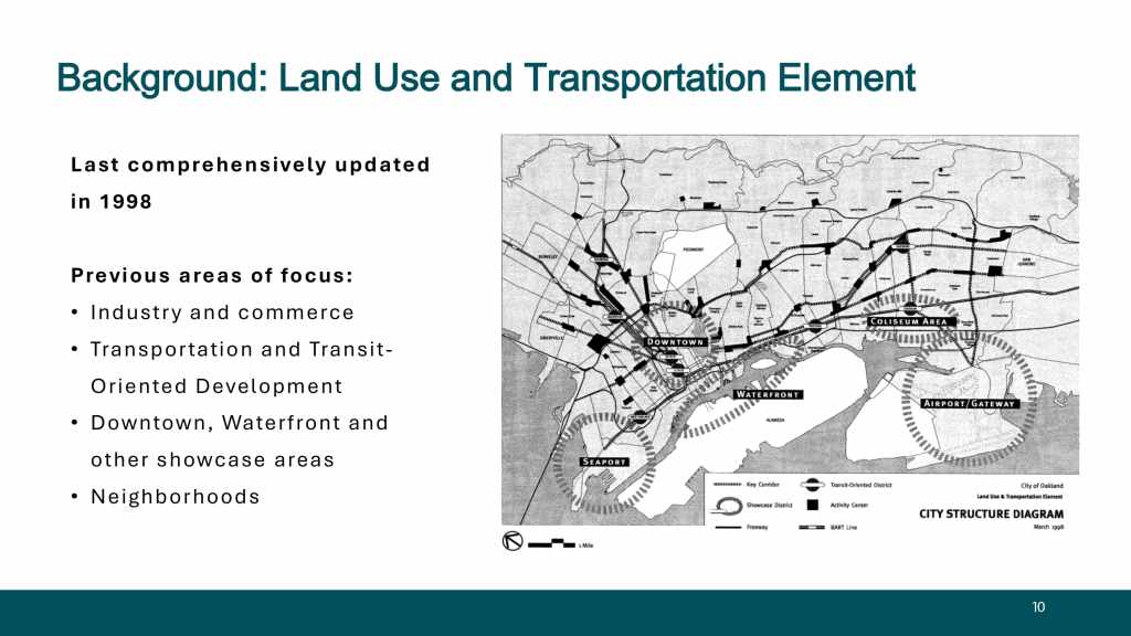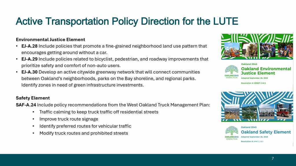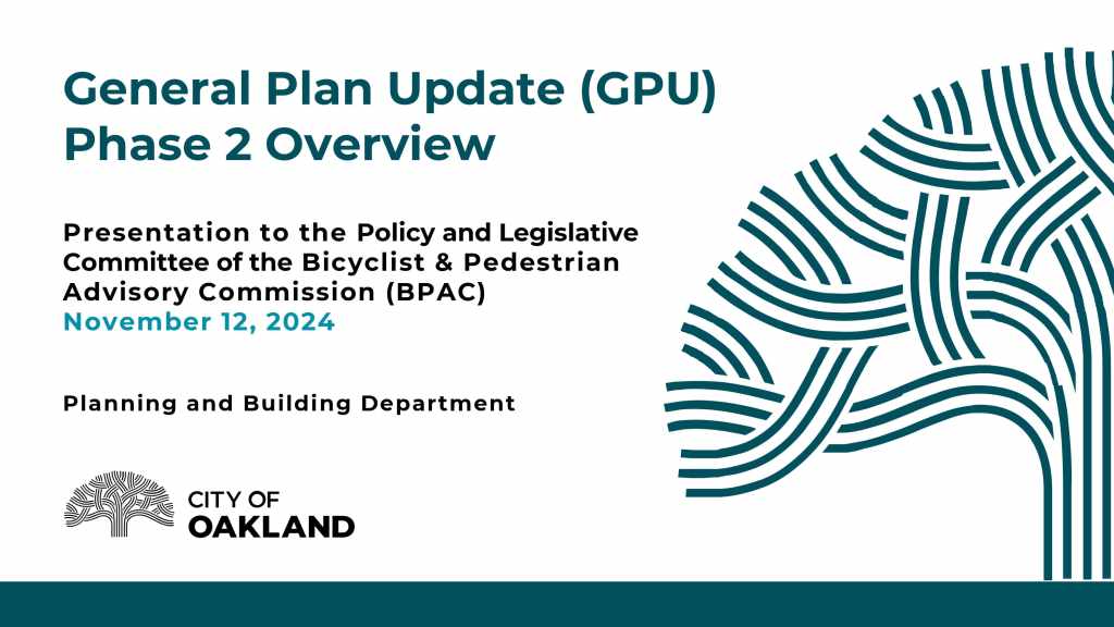 At the November 12, 2024 BPAC Policy and Legislative Committee meeting, Oakland Planning Bureau staff provided an overview of the General Plan Update, with a focused discussion on the LUTE’s role in promoting active transportation and welcomes feedback from the BPAC.