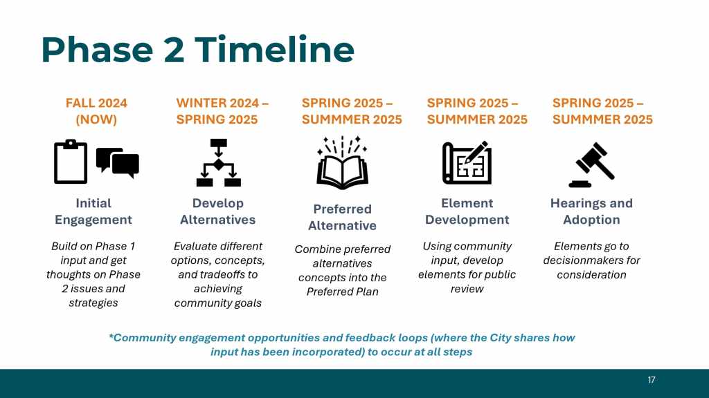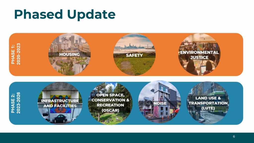 The Oakland General Plan Update process has two phases. Phase 1 began in November 2021 and concluded in October 2023. We adopted the Housing, Environmental Justice, and Safety Elements. Phase 2, initiated in Fall 2024, focuses on the Land Use and Transportation Element (LUTE), Open Space, Conservation, and Recreation (OSCAR) Element, Noise Element, and the Infrastructure and Capital Facilities Element.
