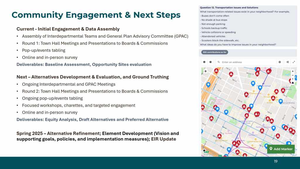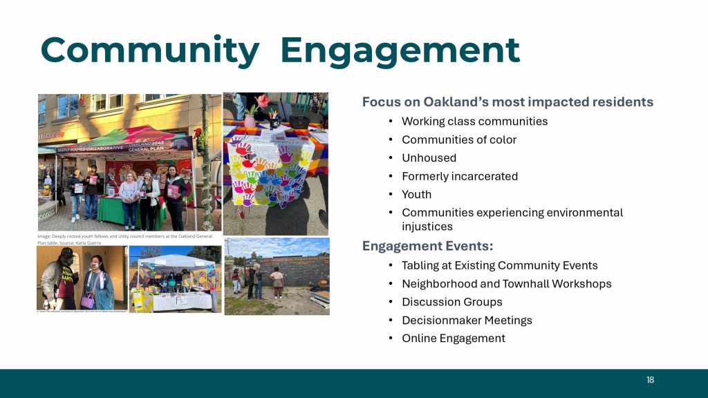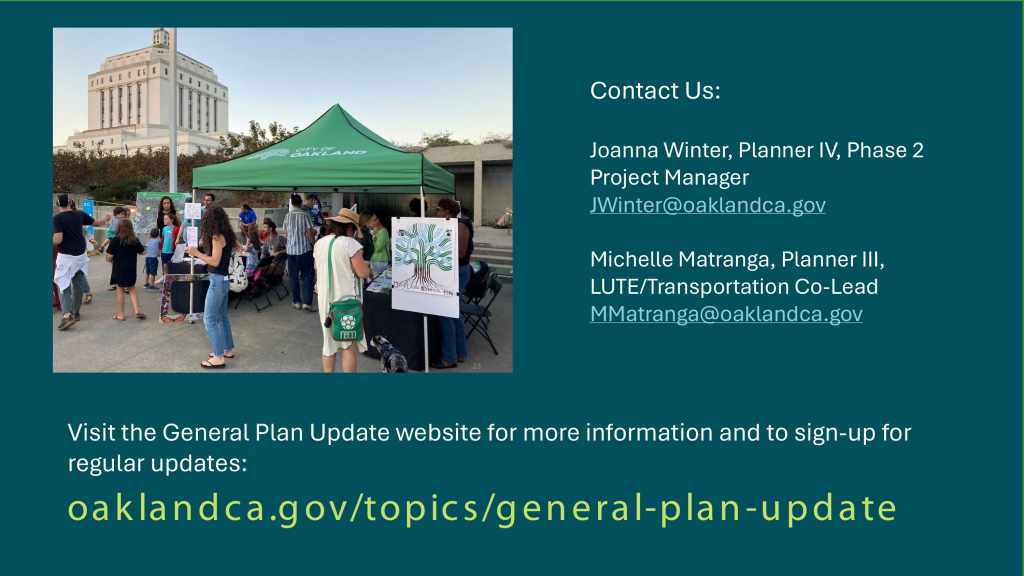 The City of Oakland is currently updating its General Plan and wants to hear from community members. The Oakland General Plan Update will set forth a vision for Oakland’s future development that reflects community priorities and values. We aim to create livable and connected neighborhoods where people have access to everything they need, such as grocery stores, entertainment, stores, libraries, parks, and safe transportation. Once adopted in 2026, the General Plan will guide the city’s development for the next 20 years.