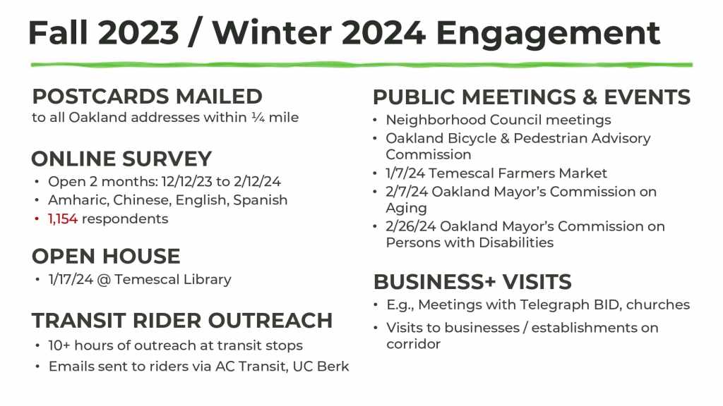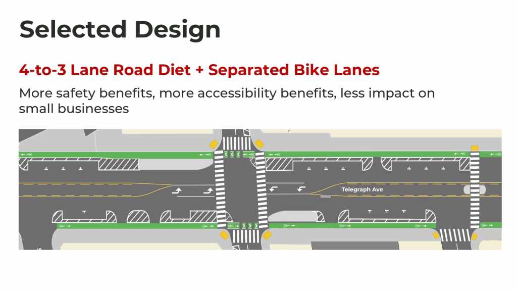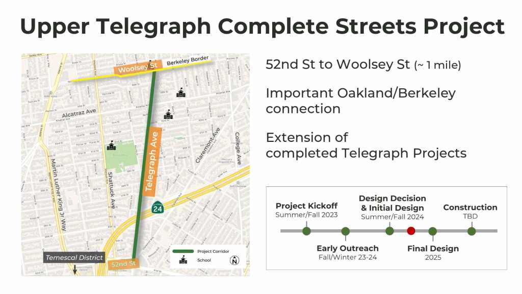 At the November 7, 2024 BPAC Infrastructure Committee meeting, Cathy DeLuca, Oakland DOT staff, provided an update on the Upper Telegraph Avenue Complete Streets Project (52nd St to Woolsey St), including information on the decision to move forward with a 4-to-3 Lane Road Diet design alternative.