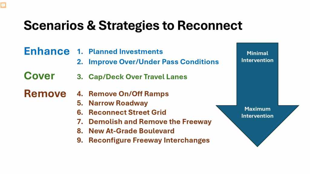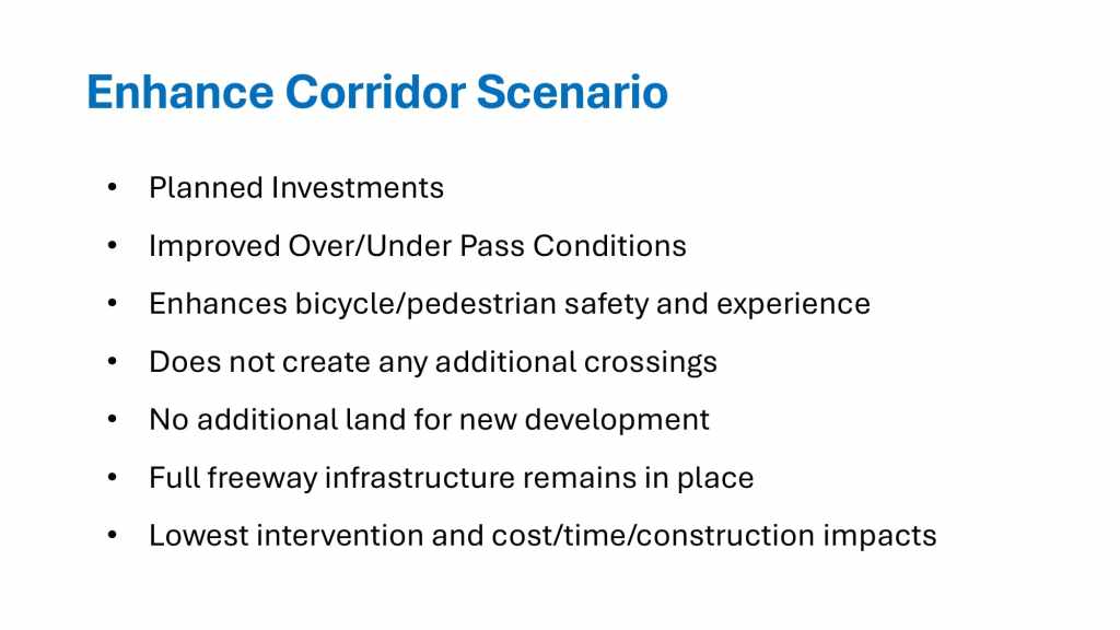 - Frees up to 67 acres of land for new development based on community priorities for the full length of the freeway.
