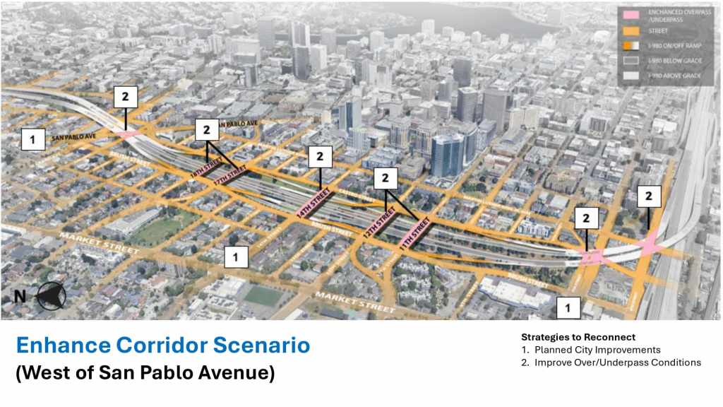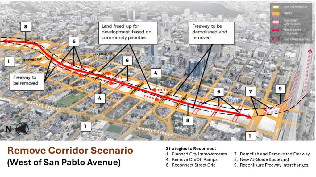 - Removes Interstate 980 and redirects traffic to new boulevard