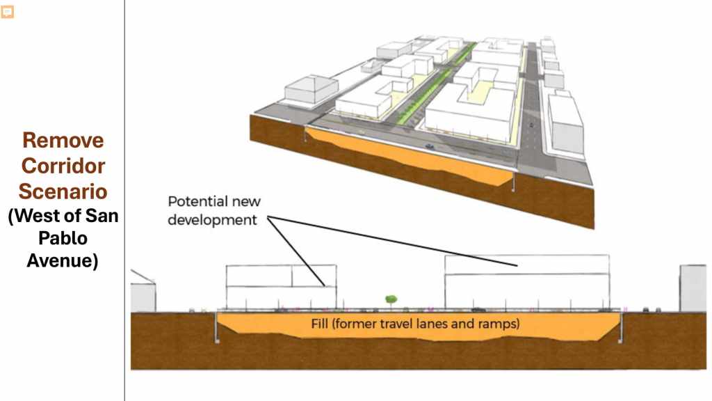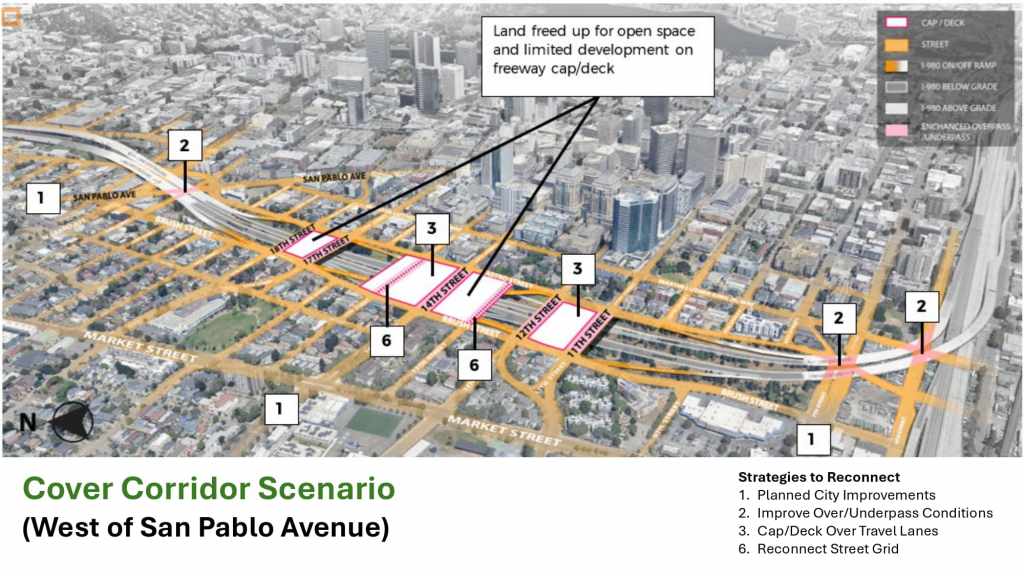 - Cap/decks over the depressed freeway west of San Pablo Avenue and between 34th Street & I-580