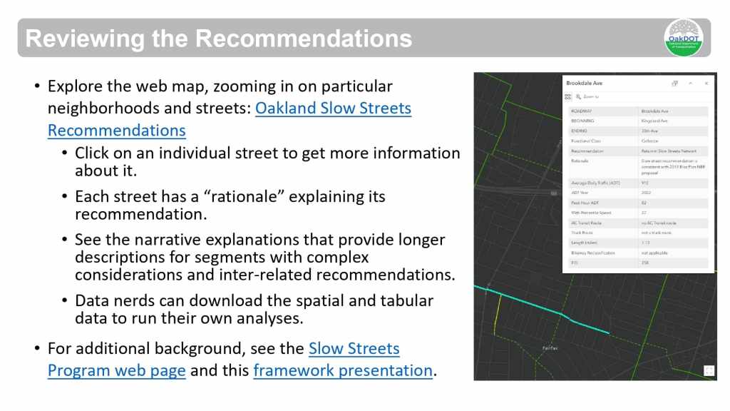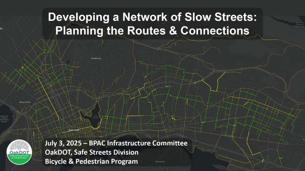 At the July 3, 2025 BPAC Infrastructure Committee meeting, OakDOT Bicycle and Pedestrian Program staff will present draft recommendations for a Slow Streets network in Oakland. Slow Streets were initially an OakDOT innovation during the COVID-19 pandemic to provide physically distanced outdoor spaces for residents. Staff are taking lessons learned from the pandemic and applying them to Oakland’s work-to-date developing bike boulevards and neighborhood bike routes (NBRs). Staff are proposing these routes be re-envisioned as slow streets for travel at human-powered speeds while simultaneously making these streets more welcoming for residents to use as public spaces. The presentation explains the purpose, planning criteria, and methodology for developing the draft Slow Streets network. View the interactive web map of the draft Slow Streets network.