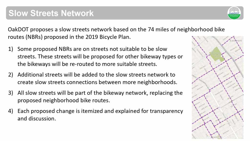 OakDOT proposes a slow streets network based on the 74 miles of neighborhood bike routes (NBRs) proposed in the 2019 Bicycle Plan.