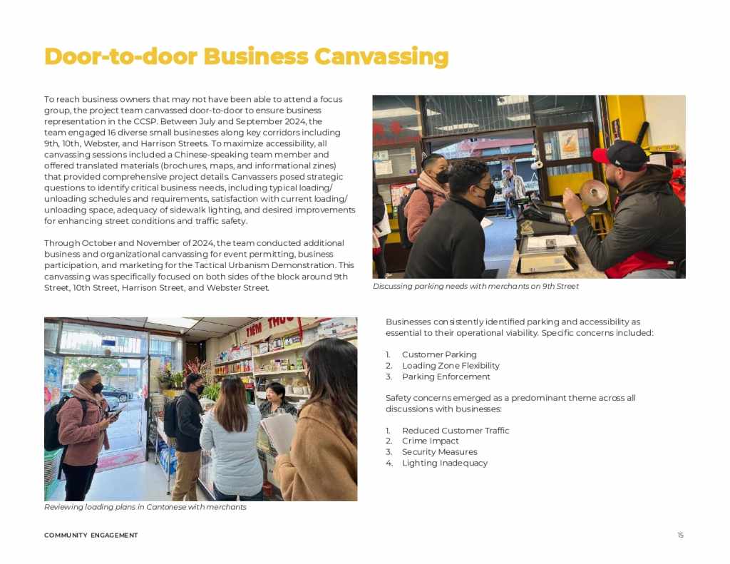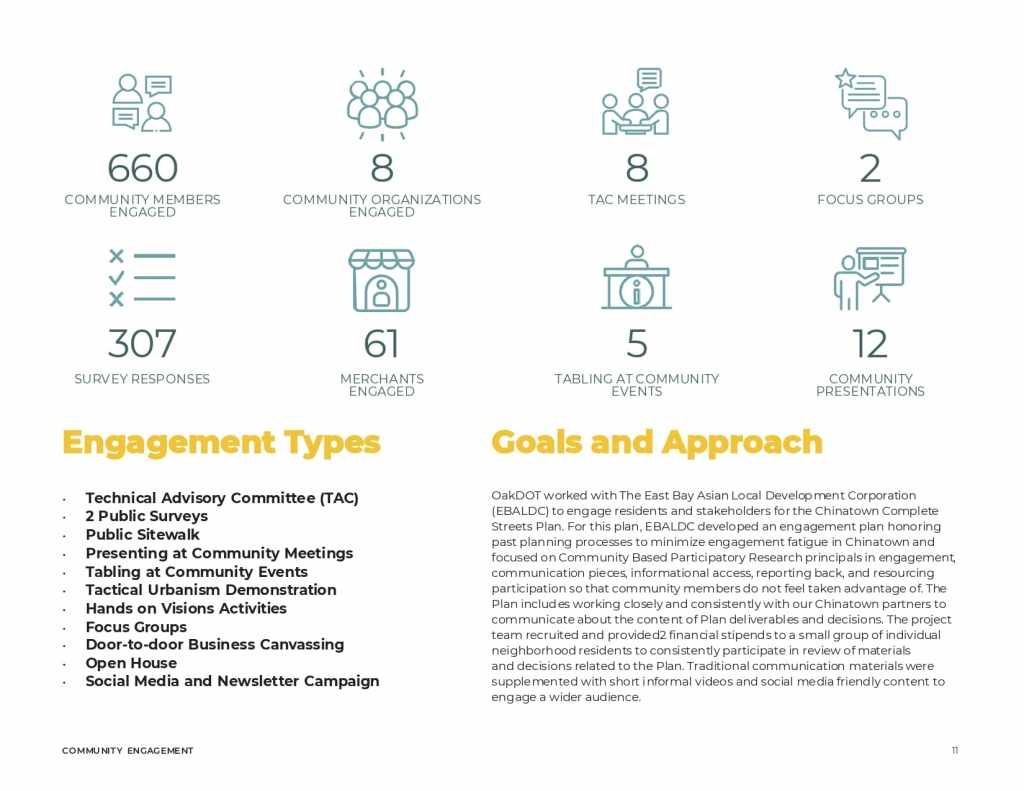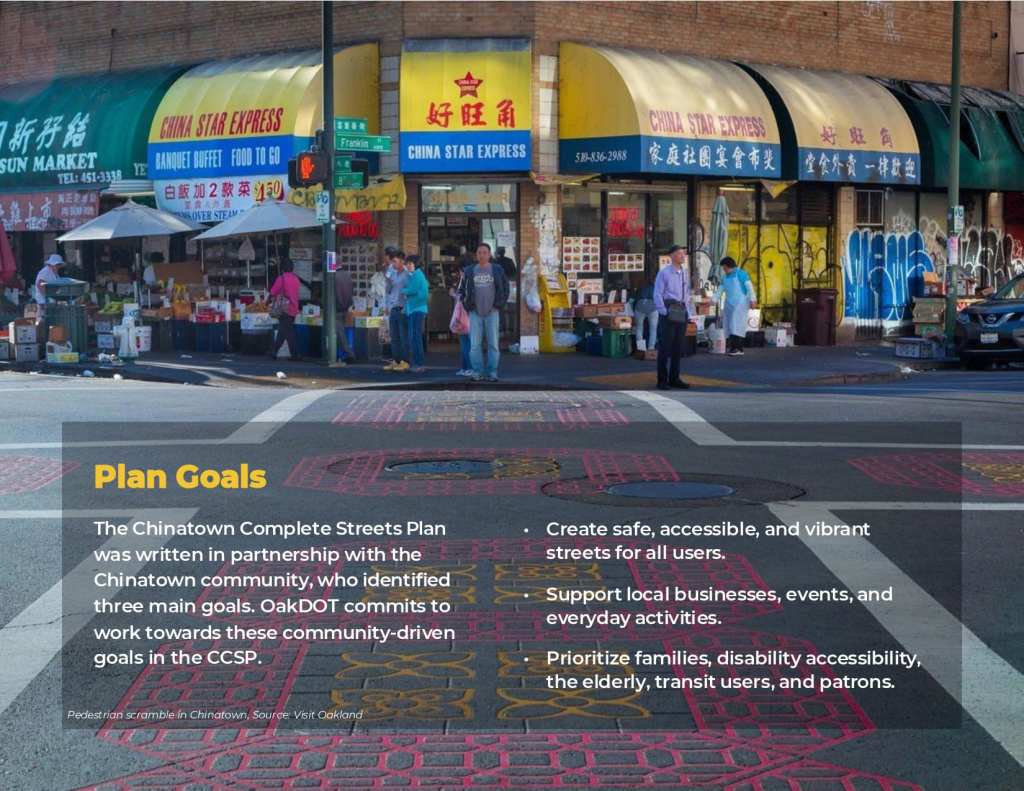 The Chinatown Complete Streets Plan was written in partnership with the Chinatown community, who identified three main goals. OakDOT commits to work towards these community-driven goals in the CCSP.