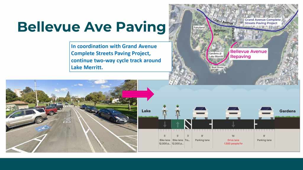 - In coordination with Grand Avenue Complete Streets Paving Project, continue two-way cycle track around Lake Merritt.
