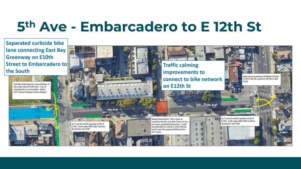 - Separated curbside bike lane connecting East Bay Greenway on E10th Street to Embarcadero to the South