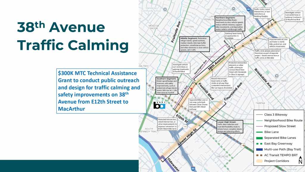 - $300K MTC Technical Assistance Grant to conduct public outreach and design for traffic calming and safety improvements on 38th Avenue from E12th Street to MacArthur