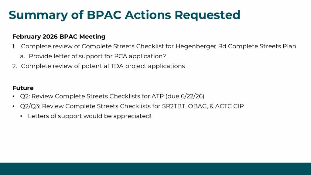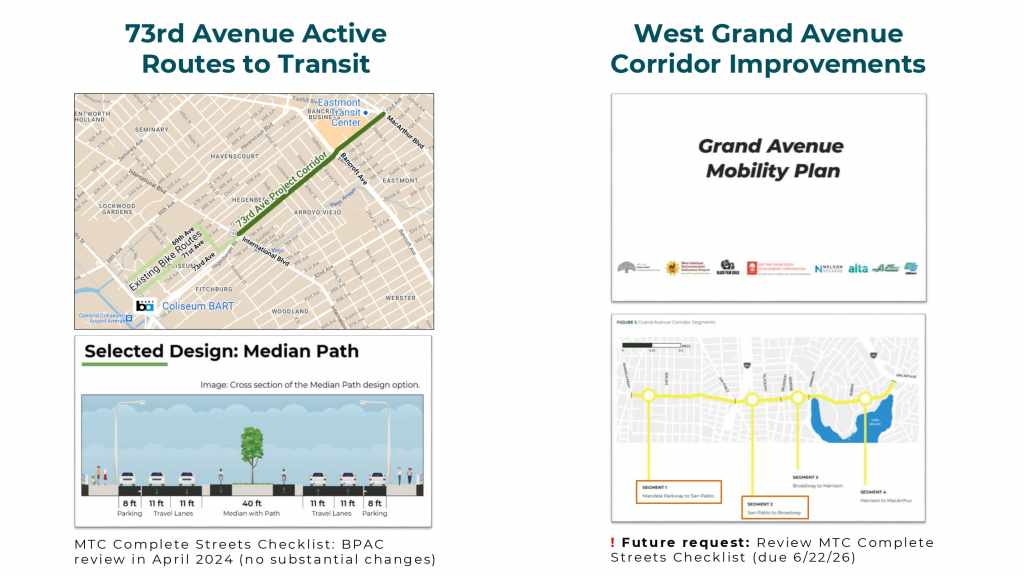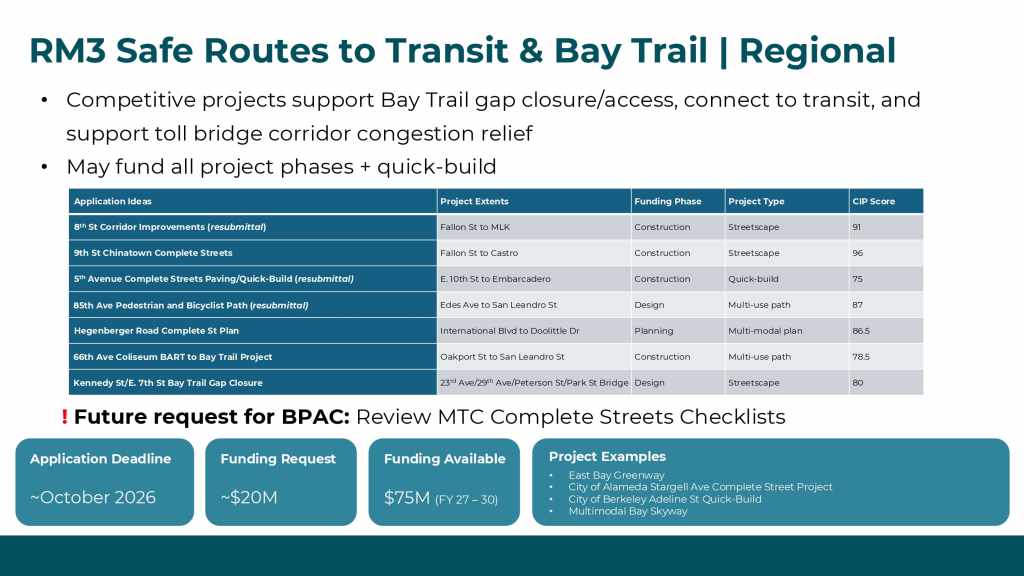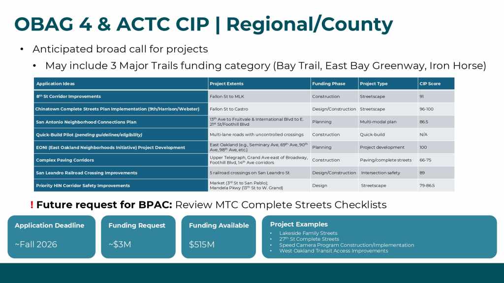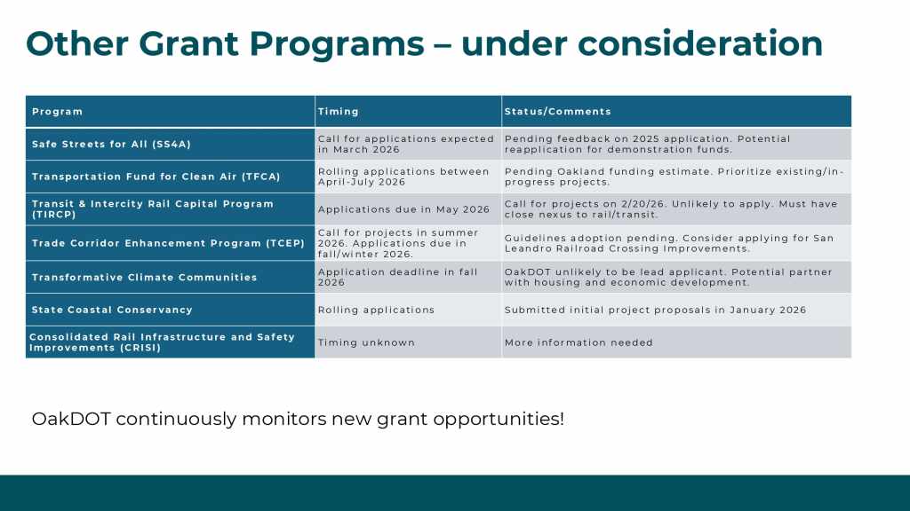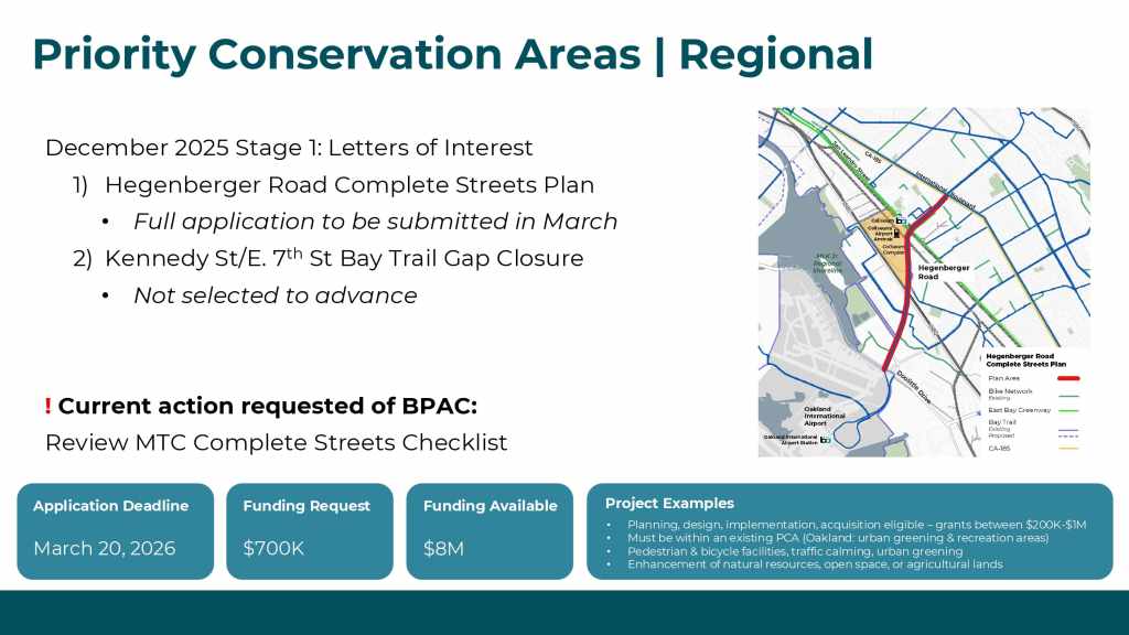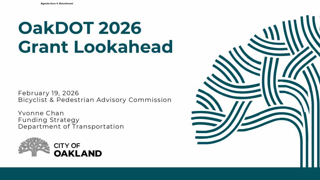 At the February 19, 2026 BPAC Agenda BPAC meeting, Yvonne Chan, Transportation Planner in OakDOT’s Funding Strategy Team, provided a lookahead of OakDOT’s grant application strategy in 2026. This will include a summary of key grant programs, upcoming deadlines, and draft applications (ranging from initial proposals to nearly complete applications). In addition to an overall lookahead, this presentation will include (1) review of the MTC Complete Streets Checklist for the Hegenberger Road Complete Streets Plan and (2) review of potential Fiscal Year 2027 Transportation Development Act Article 3 (TDA 3) project applications. Current grant-funded projects are shown in the OakDOT Projects Map.