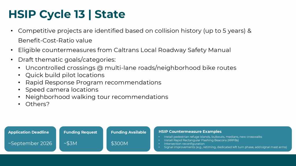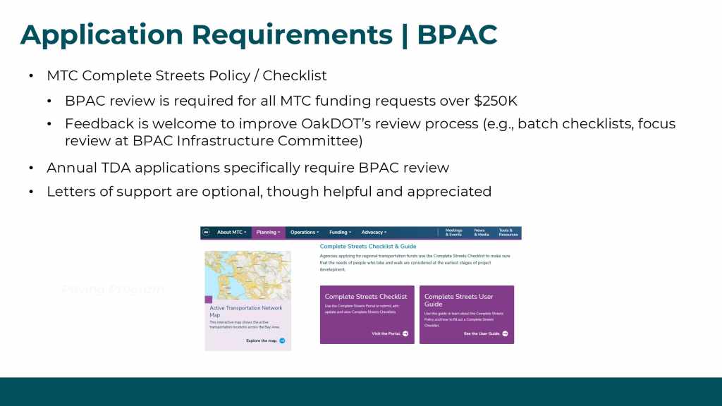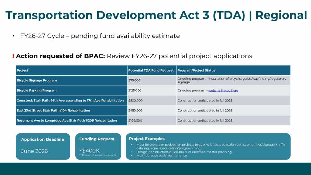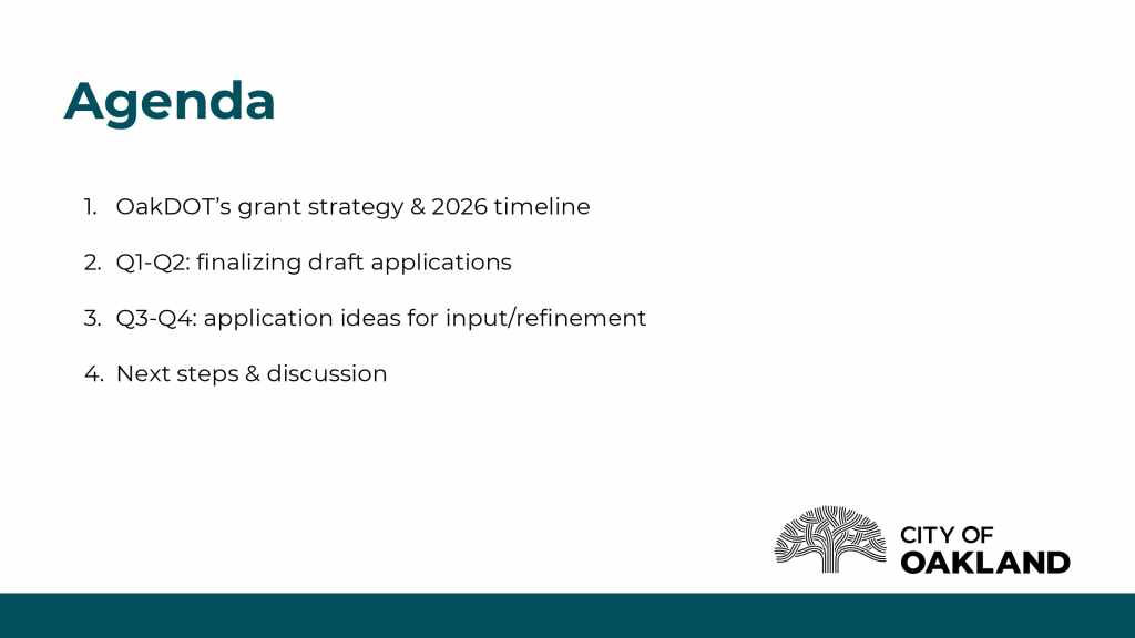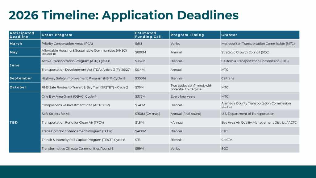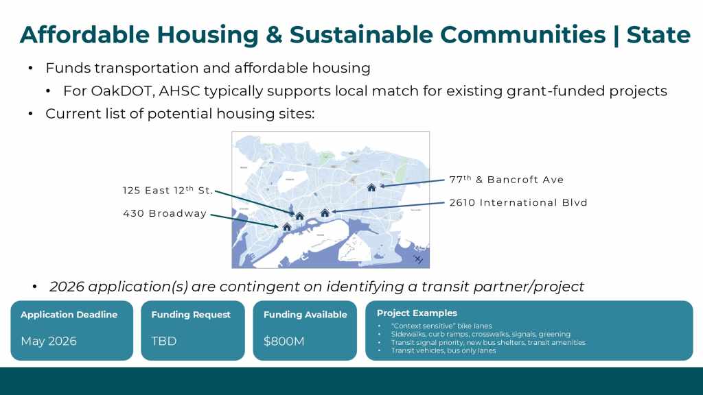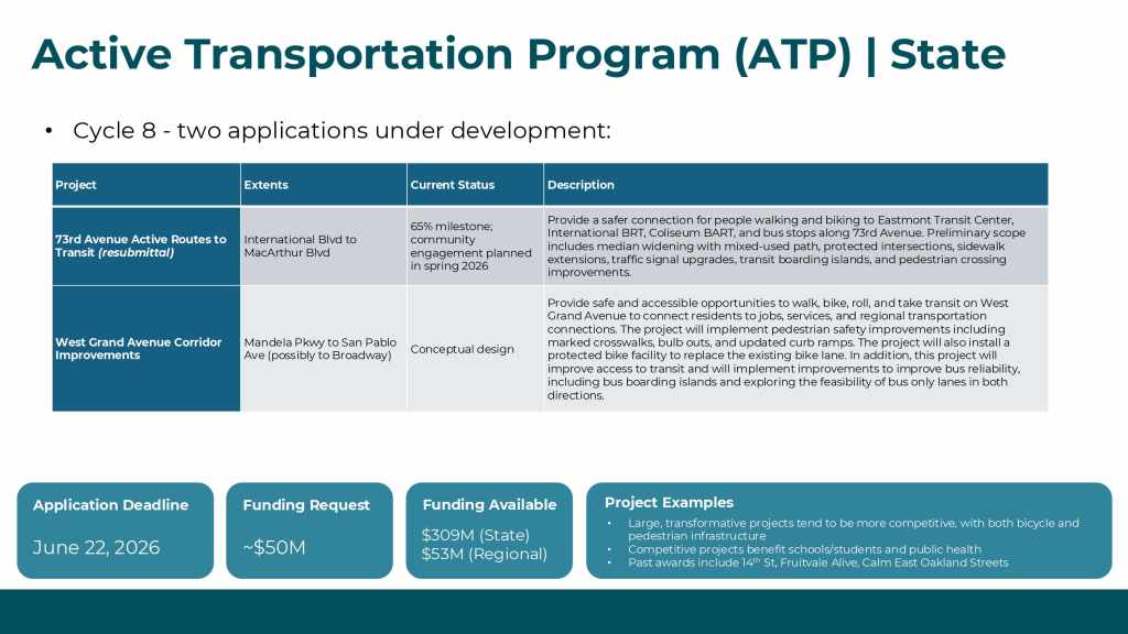 At the February 19, 2026 BPAC Agenda BPAC meeting, Yvonne Chan, Transportation Planner in OakDOT’s Funding Strategy Team, provided a lookahead of OakDOT’s grant application strategy in 2026. This will include a summary of key grant programs, upcoming deadlines, and draft applications (ranging from initial proposals to nearly complete applications). In addition to an overall lookahead, this presentation will include (1) review of the MTC Complete Streets Checklist for the Hegenberger Road Complete Streets Plan and (2) review of potential Fiscal Year 2027 Transportation Development Act Article 3 (TDA 3) project applications. Current grant-funded projects are shown in the OakDOT Projects Map.