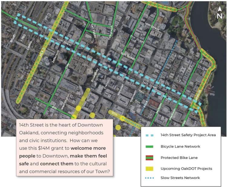 “14th Street is the heart of Downtown Oakland, connecting neighborhoods and civic institutions. How can we use this $14M grant to welcome more people to Downtown, make them feel safe and connect them to the cultural and commercial resources of our Town?”