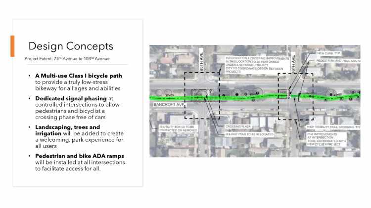 The Bancroft Ave Greenway project seeks to provide a low-stress Class I multi-use path on the existing Bancroft Avenue median from 73rd Avenue to 103rd Avenue. This will involve dedicated bicycle signals at all intersections and new pedestrian-scale lighting. In addition, this project will install new wayfinding signage, benches, landscaping and spaces for people to meet or picnic. This project is a result of community engagement for multiple planning efforts and was previously submitted to the ATP Cycle 5 grant.
