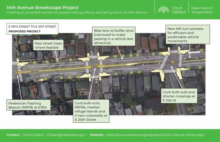 The next phase of The 14th Avenue Streetscape project will deliver an important bicycle connection on 14th Avenue from Foothill to 27th Street/Highland Hospital. This project will form the foundation for a complete network connection north to MacArthur Blvd. This project will also make pedestrian crossing improvements and striping upgrades between E8th Street and International Blvd.