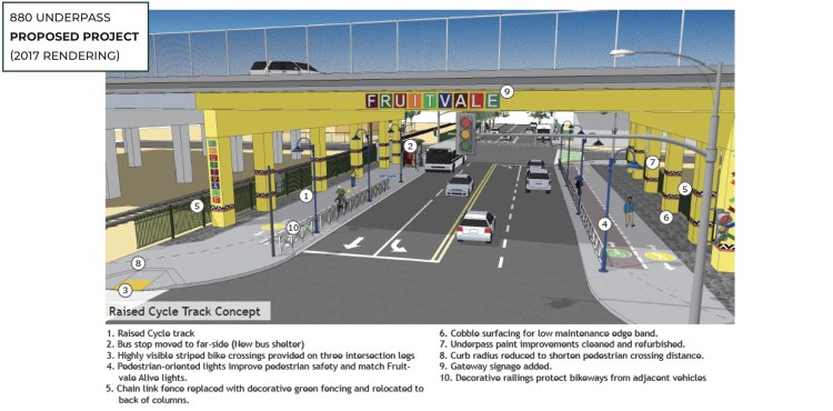 The Fruitvale Alive project is an ATP-funded project to install sidewalk-level protected bike lanes to connect the Fruitvale Ave Bridge with Fruitvale BART Station and E12th Street. In addition to closing a critical gap in the City’s protected bike infrastructure, the project will connect to a new segment of the Bay Trail at the southern end of Fruitvale Avenue and will address problematic “pork chop” islands at E12th Street. OakDOT has reached Final Design of the project and expects to advertise for construction in January 2021.