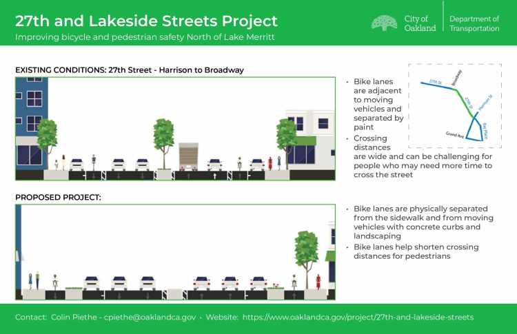 At the May 19, 2022 BPAC meeting, OakDOT Transportation Planner Colin Piethe presented on the 27th and Lakeside Streets Project. An excerpt of the presentation is below, followed by the full presentation [PDF], and summary of discussion.