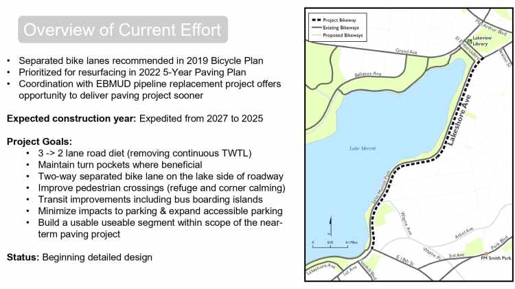 At the March 7, 2024 BPAC Infrastructure Committee meeting, OakDOT staff in the Safe Streets Division, Bicycle and Pedestrian Program will provide an introduction to the Lakeshore Ave Separated Bike Lanes Project. After a brief background, the presentation and discussion will focus on the concept plans for the proposed two-way cycle track on Lakeshore Avenue from East 18th Street to El Embarcadero.