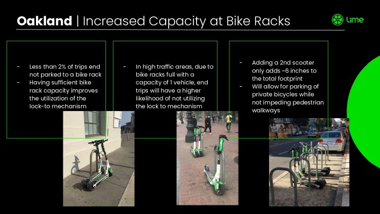 Starting November 2020, shared e-scooters were required to lock to a bike rack, in-street corral or City street signs when not in use.